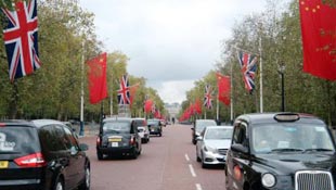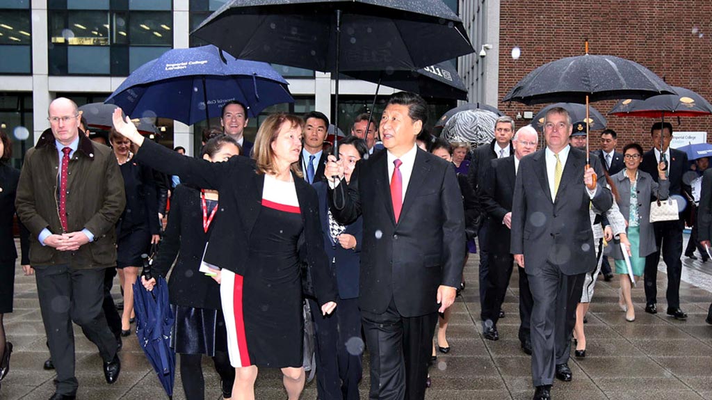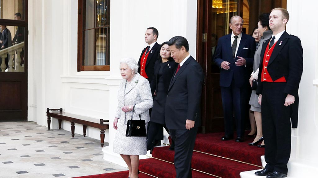 此訪是10年來中國國家主席首次對英國進(jìn)行國事訪問。習(xí)近平和夫人彭麗媛在機(jī)場受到英國女王代表胡德子爵、外交大臣哈蒙德等熱情迎接。英國青年向習(xí)近平夫婦獻(xiàn)上鮮花。