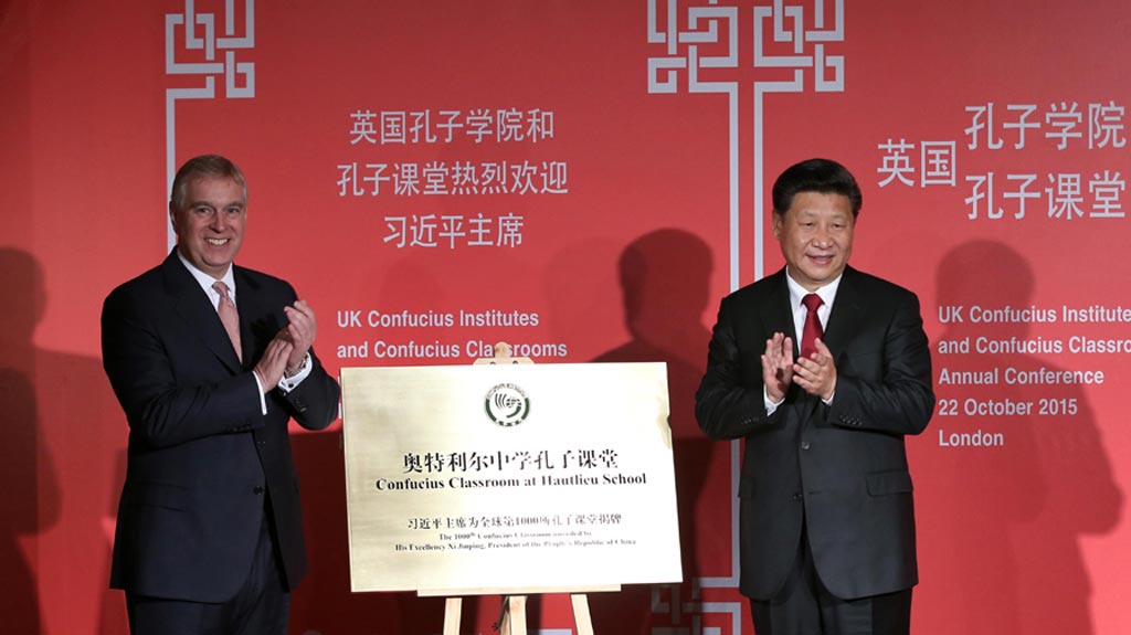 這是習(xí)近平和約克公爵安德魯王子共同為全球第1000所孔子課堂——奧特利爾中學(xué)孔子課堂揭牌。”圖為:2015年10月21日,國家主席習(xí)近平在倫敦唐寧街首相府同英國首相卡梅倫舉行會談。
