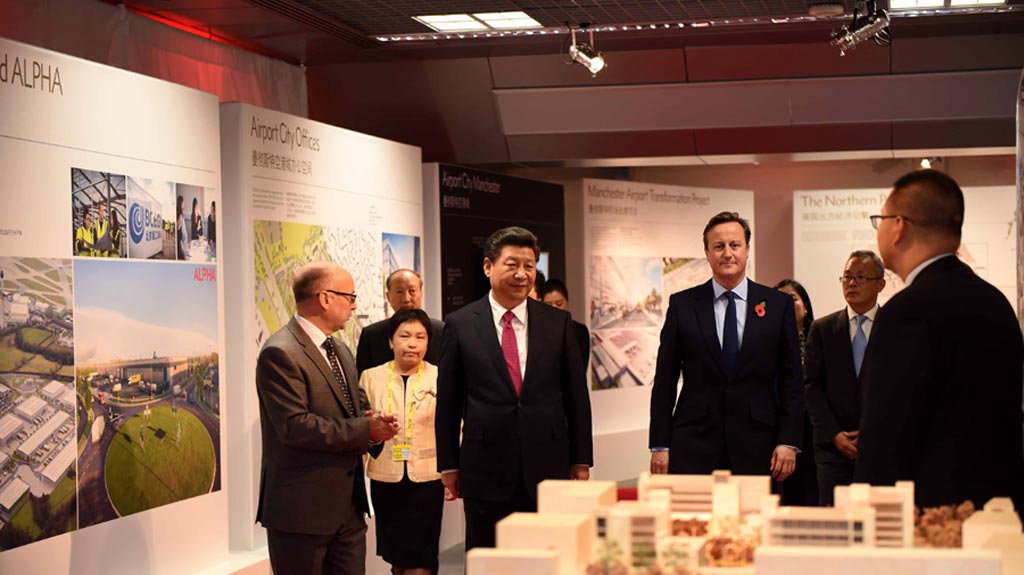 兩國領(lǐng)導(dǎo)人共同參觀曼徹斯特空港城發(fā)展規(guī)劃圖片展和空港城中國園模型,聽取中國海南航空公司北京—曼徹斯特航線開通情況有關(guān)介紹,并發(fā)表致辭。