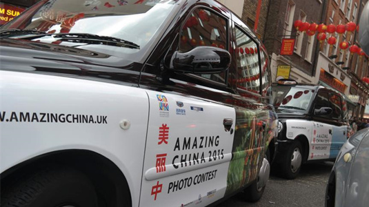10月19日至23日,中國國家主席習近平將對英國進行國事訪問。習近平主席訪問前夕,50輛噴繪有“美麗中國”照片圖案的英國出租車走上倫敦街頭,成為一道引人矚目的亮麗風景線。