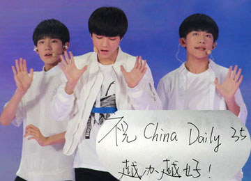 國內(nèi)人氣組合TFBOYS在中國日?qǐng)?bào)35歲生日之際,特意送來生日祝福,祝福中國日?qǐng)?bào)35周年生日快樂。