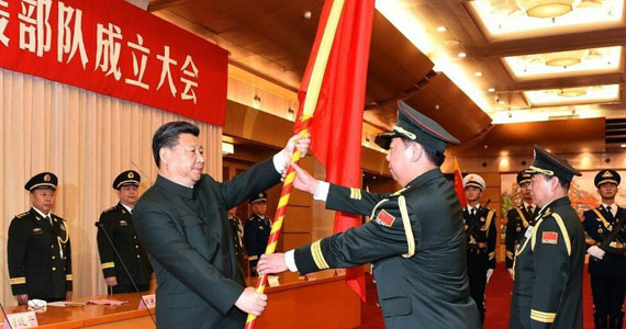 中國(guó)人民解放軍陸軍領(lǐng)導(dǎo)機(jī)構(gòu)、中國(guó)人民解放軍火箭軍、中國(guó)人民解放軍戰(zhàn)略支援部隊(duì)成立大會(huì)12月31日在八一大樓隆重舉行。中共中央總書(shū)記、國(guó)家主席、中央軍委主席習(xí)近平向陸軍、火箭軍、戰(zhàn)略支援部隊(duì)授予軍旗并致訓(xùn)詞,代表黨中央和中央軍委向同志們、向全軍部隊(duì)致以熱烈祝賀。
