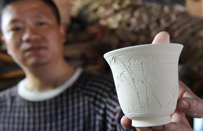 4月10日,陶瓷愛好者陳添貴在準(zhǔn)備放入窯中燒制的茶具坯體。