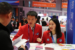 2018年11月7日,進博會現(xiàn)場,志愿者志愿者為觀眾解答問題。正在上海舉行的首屆中國國際進口博覽會總計招募志愿者超過5400人,他們參與進博會籌備工作和場館內外的各項服務保障,為進博會順利舉行和觀眾省心參觀作出貢獻。