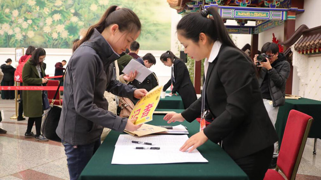2018年3月1日,2018年全國兩會即將召開,在人民大會堂,記者排隊領取記者證。目前已有3000多名中外記者報名采訪全國兩會,其中境內記者2000人左右,港澳臺記者和外國記者1000多人。