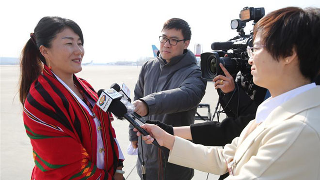 3月2日,出席十三屆全國人大一次會議的西藏代表團乘坐飛機抵達北京。
