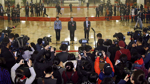 會議結束后,國家發展和改革委員會主任何立峰、國家衛生和計劃生育委員會主任李斌、水利部部長陳雷、國家工商行政管理總局局長張茅、中國銀行業監督管理委員會主席郭樹清、國務院港澳事務辦公室主任張曉明在“部長通道”接受采訪。