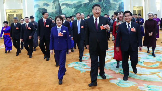 5日下午,中共中央總書記、國家主席、中央軍委主席習近平來到他所在的十三屆全國人大一次會議內蒙古代表團參加審議。習近平總書記向內蒙古廣大干部群眾表示衷心感謝,并同代表們合影。