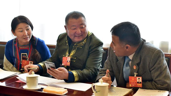 3月7日下午,在內蒙古代表團小組討論會前,代表們就憲法修正案草案進行討論。人民網記者 翁奇羽 攝 3月7日,來自基層的楊金龍代表(右)與劉廷代表就憲法修正案草案談個人體會。