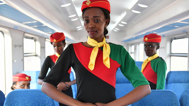 4月13日,在肯尼亞蒙內(nèi)鐵路一列測試列車上,乘務(wù)員練習(xí)迎賓禮儀。新華社記者孫瑞博攝 肯尼亞蒙內(nèi)鐵路聯(lián)調(diào)聯(lián)試工作目前平穩(wěn)推進(jìn),為預(yù)計(jì)的6月通車試運(yùn)營做好全方位準(zhǔn)備。肯尼亞總統(tǒng)肯雅塔2015年視察該項(xiàng)目時(shí)曾表示,這是肯尼亞在過去半個(gè)多世紀(jì)里興建的最大基建項(xiàng)目。