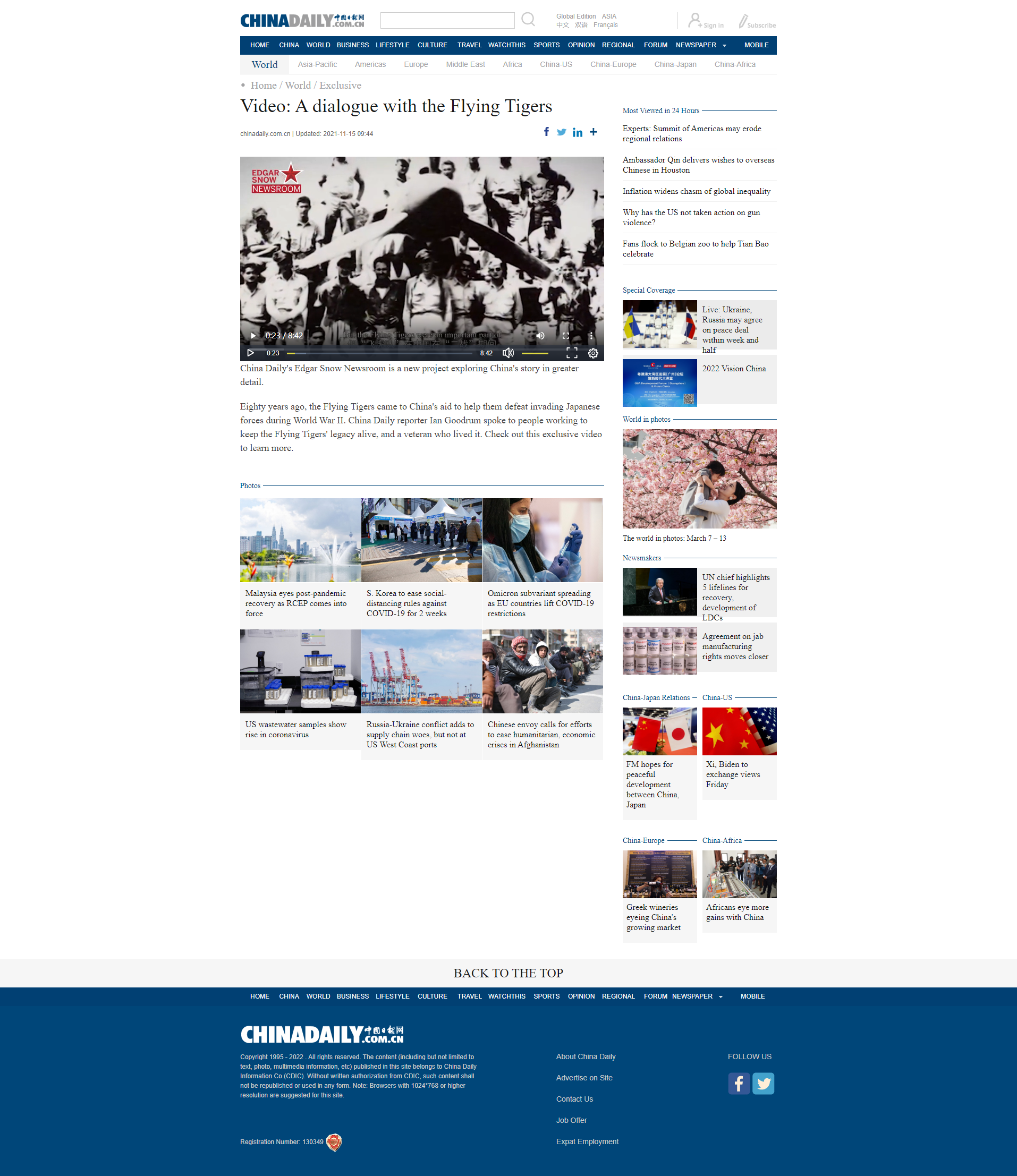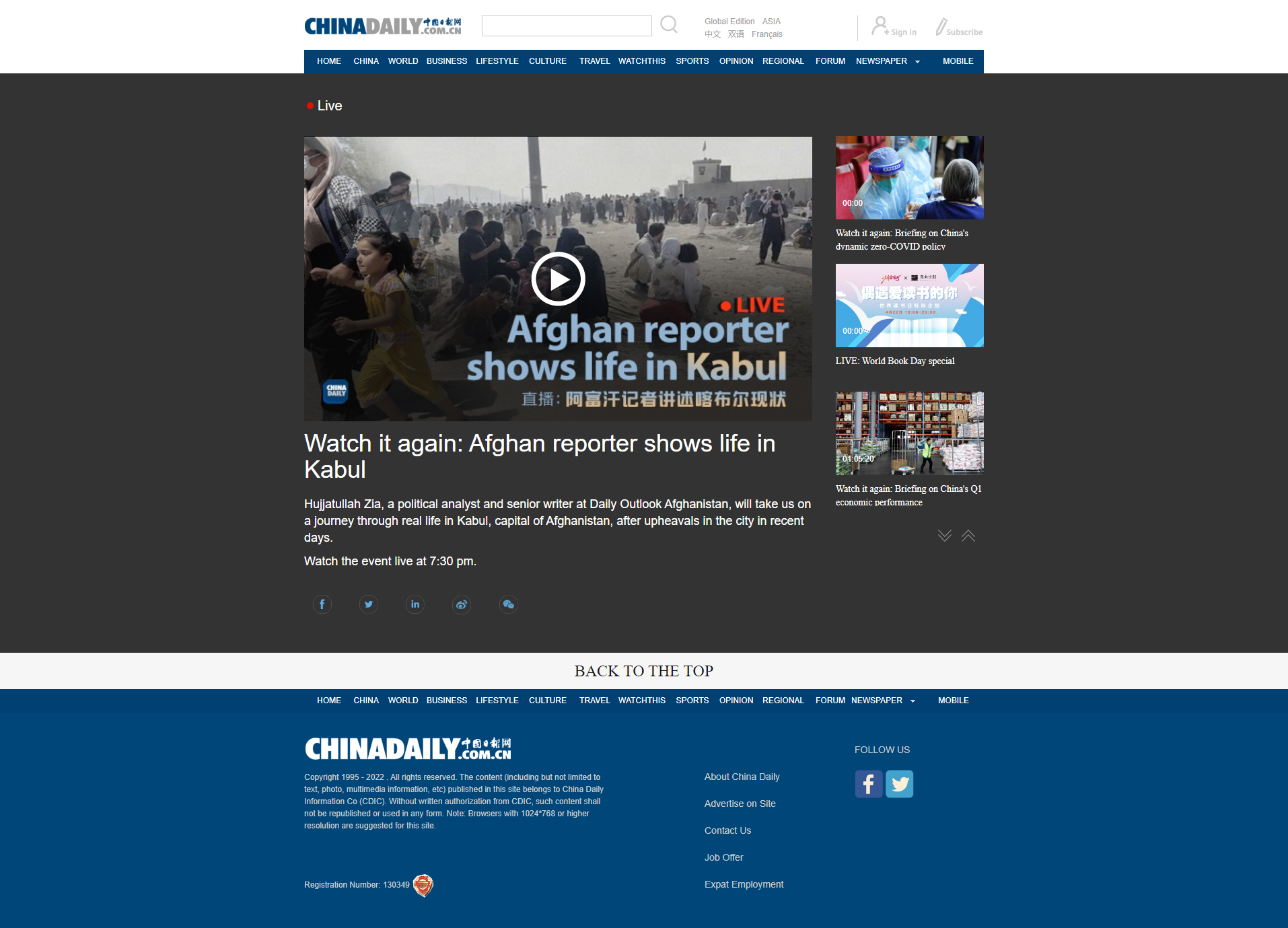 根據《中國新聞獎評選辦法》有關規定,經中國日報社各采編部門、各駐地方機構、各駐境外機構等推薦,并經過社內部評審、編委會集體審議,社領導批準,推薦音視頻新聞直播《LIVE:Afghan reporter shows life in Kabul(直播:阿富汗記者講述喀布爾現狀)》、國際傳播-音視頻新聞訪談《Video: A dialogue with the Flying Tigers(美國飛虎隊來華抗戰80周年:對話飛虎隊)》、音視頻新聞訪談《潘維廉:中國民主是一種務實的民主》參加第32屆中國新聞獎音視頻新聞訪談、音視頻新聞直播,現予以公示。