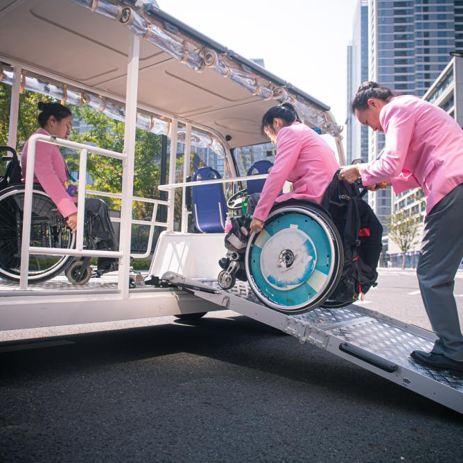 2023年10月16日,中國體育代表團成員在杭州亞殘運村內乘坐無障礙接駁車出行。圖片來源:新華社