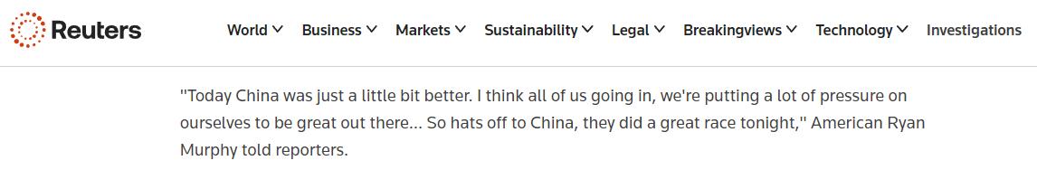 中國選手的優異表現不僅贏得了獎牌,也收獲了對手的尊重。據路透社報道,在男子4x100米混合泳接力決賽后,美國選手瑞恩·墨菲接受采訪時表示,“今天中國隊表現要更好一些……我要向中國隊致敬,他們今晚的比賽非常精彩。”