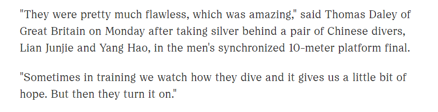 據美國國家公共電臺報道,英國選手托馬斯·戴利在雙人男子10米臺決賽中不敵中國跳水運動員練俊杰與楊昊,獲得銀牌。戴利表示:“他們的表現幾乎完美無缺,真是太棒了。有時在訓練中,我們會觀察他們的跳水動作,這給了我們一點希望。但隨后他們就反擊了?!?/p>