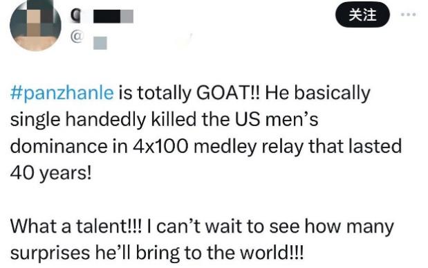 一位海外網友在海外社交媒體平臺X上大贊潘展樂,“潘展樂是偉大的游泳運動員……他真是個天才!我迫不及待地想看看他會給世界帶來多少驚喜!”