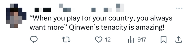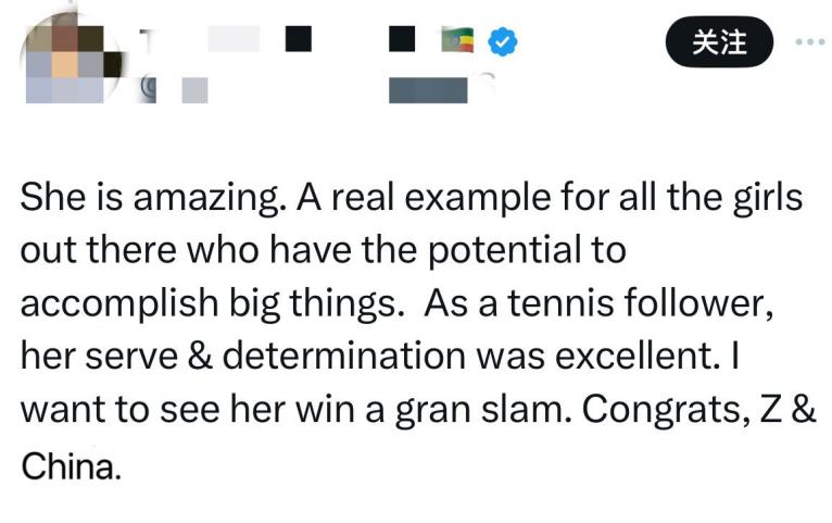 一位X用戶寫道:(鄭欽文)太棒了。對于所有要做大事的女孩來說,她是一個生動的榜樣。作為一名網球愛好者,她的發球和決心非常出色。我希望看到她贏得大滿貫。恭喜鄭欽文和中國隊。