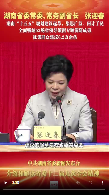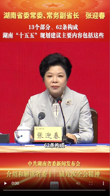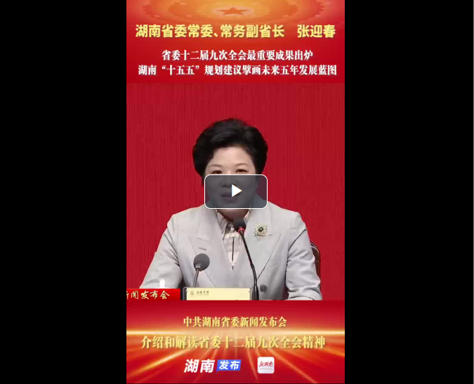 11月29日,省委十二屆九次全會新聞發布會在長沙召開。省委常委、常務副省長張迎春出席發布會介紹,全會圓滿完成各項議程,最重要的成果是審議通過了《中共湖南省委關于制定湖南省國民經濟和社會發展第十五個五年規劃的建議》(以下簡稱《建議》),為湖南未來五年發展擘畫了藍圖、明確了路徑。