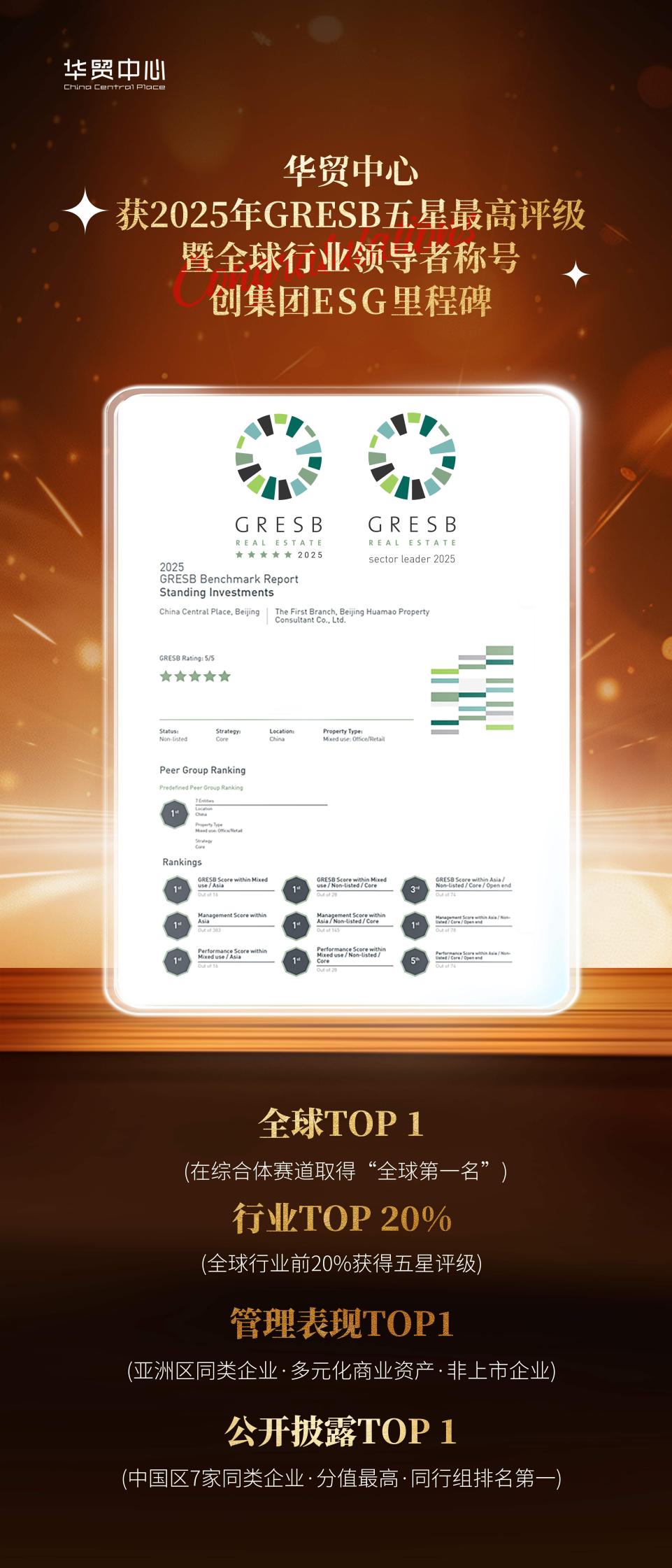 就在剛剛過去的10月,由北京市朝陽區發展和改革委員會、北京商務中心區管理委員會、北京市朝陽區商務局指導,GRESB(全球不動產可持續發展評級體系)主辦,北京華貿中心協辦的GRESB評級中國區發布會成功舉辦。華貿中心首次參評GRESB,即獲得最高“五星評級”,并在“綜合體賽道”中取得全球第一名的成績,榮膺“全球行業領導者”稱號。其中,在混合用途、內部管理和績效等多個核心維度和指標上獲得滿分,被授予“房地產綠色之星”稱號。GRESB評級體系被業界視為ESG表現的“通用語言”,并被全球金融和資本市場廣泛認可,標志著華貿中心ESG實踐得到國際權威標準認證,領跑行業發展。