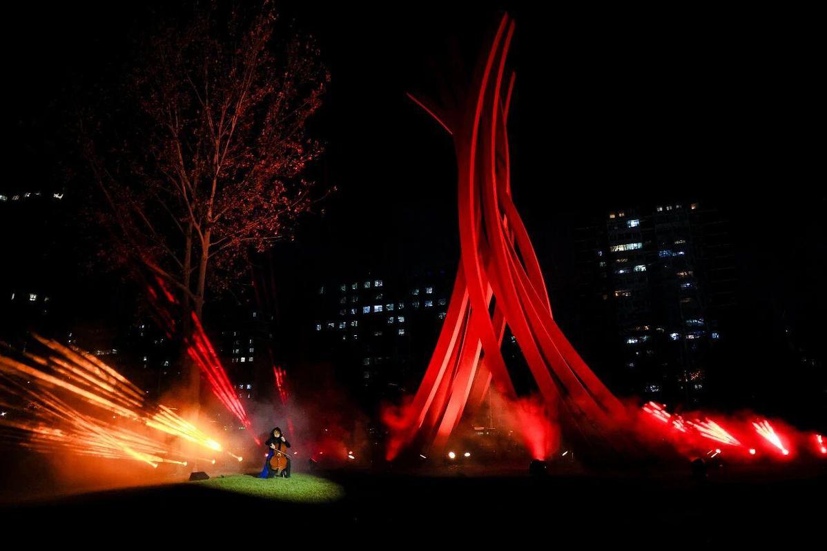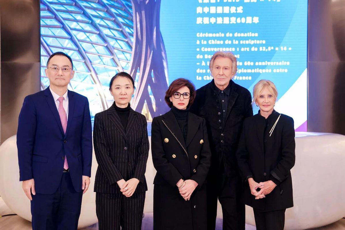 2025年12月3日晚,法國觀念藝術大師貝納維內為紀念中法建交60周年創作的雕塑《聚合:52.5?弧×14》(Convergence: arc de 52.5°×14)落戶北京,捐贈儀式在北京鳳凰中心舉行。