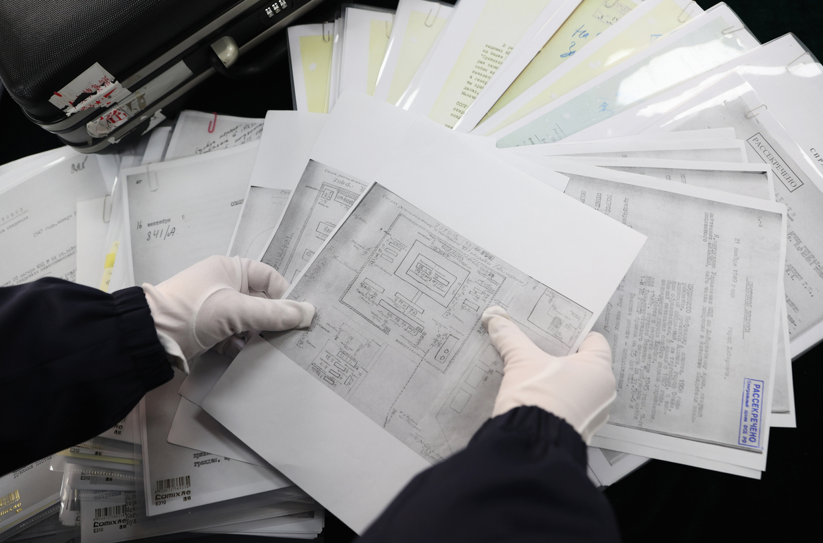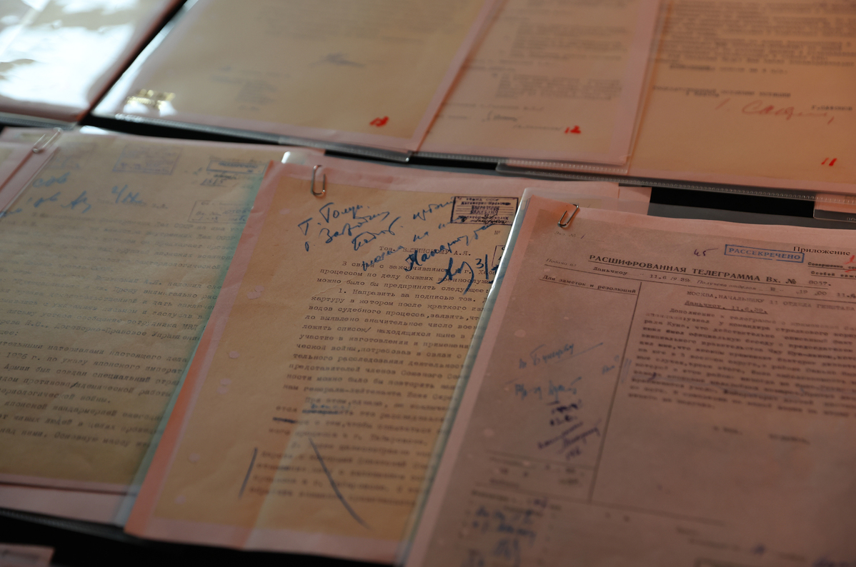 12月10日拍攝的俄羅斯轉交我方的蘇聯審訊日本731部隊的解密檔案材料。中國日報記者 鄒紅 攝