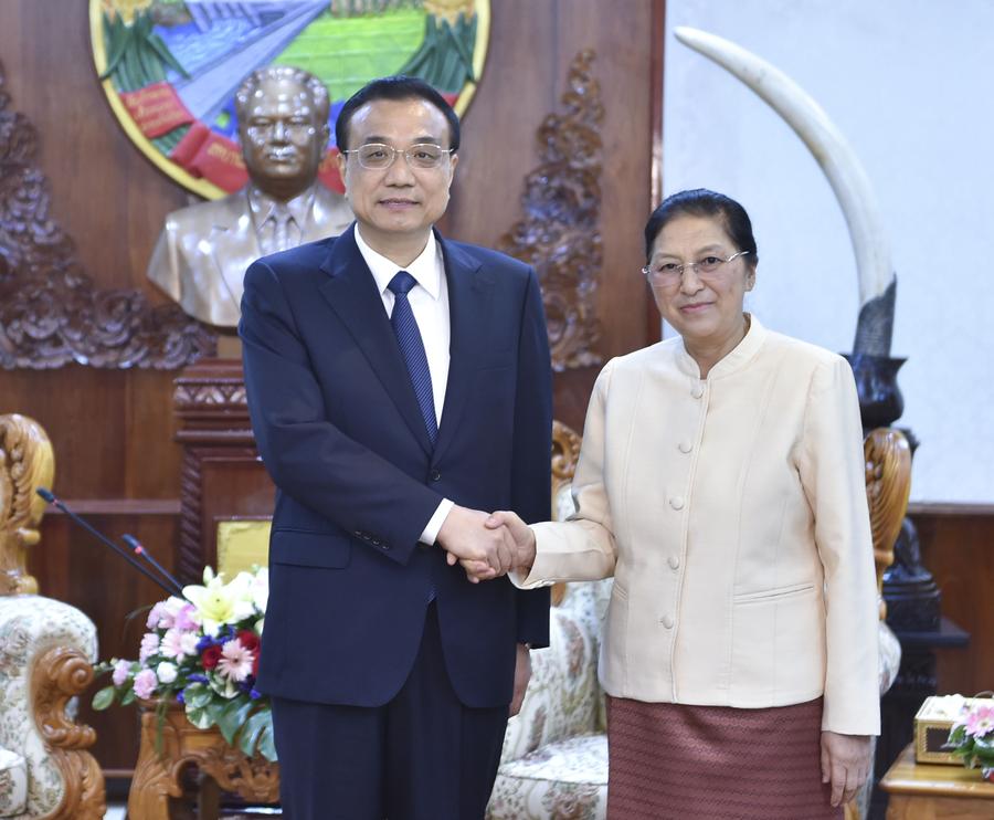 國(guó)務(wù)院總理李克強(qiáng)當(dāng)?shù)貢r(shí)間8日下午在萬象國(guó)會(huì)大廈會(huì)見老撾國(guó)會(huì)主席巴妮。