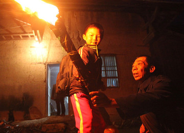 2015年8月30日報道,當城市里的孩子可以乘坐交通工具上學時,我們不敢相信遠在五峰大山里年僅七歲的裴先知卻每天打著火把前往遠在五公里外的學校求學。圖為6月20日,每當周一開學,裴先知不到凌晨五點鐘就要從床上爬起來,舉著火把走著崎嶇險峻的山路去趕學。