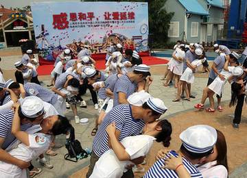 中國人民抗日戰爭暨世界反法西斯戰爭勝利70周年之際,今天上午,70對滬上情侶身著海軍服和護士服,相約上海歡樂谷,排成“70”字樣隊形,用浪漫擁吻,再現了1945年戰后紐約時代廣場的“世紀之吻”的經典畫面,用愛致敬和平,用歡樂慶祝抗戰勝利70周年。