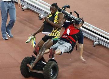當時博爾特身披國旗繞場一周,直播機位在一直在追拍他。見過世面的攝像大哥似乎也被博爾特的光環照得睜不開眼,一時沒有控制好腳下的直播車,不慎跌倒。不僅攝像機掉在了底地上,飛人博爾特也被撞翻了一個跟頭,好在并無大礙。