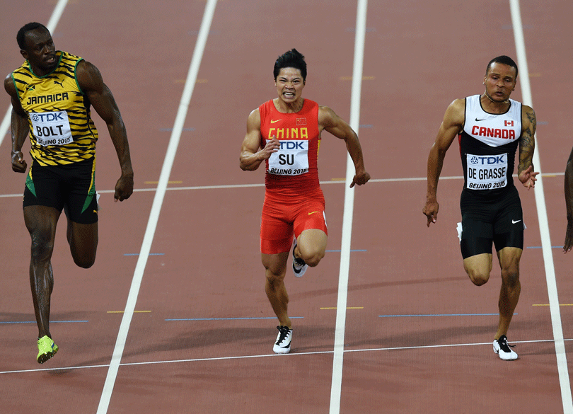 2015年8月23日,蘇炳添在半決賽中。當(dāng)日,在北京國(guó)家體育場(chǎng)“鳥巢”進(jìn)行的2015年國(guó)際田聯(lián)田徑世錦賽男子100米半決賽中,中國(guó)選手蘇炳添以9秒99的成績(jī)晉級(jí)決賽。