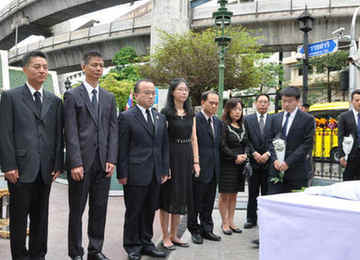 曼谷當(dāng)?shù)貢r(shí)間23日早8點(diǎn),中國(guó)駐泰國(guó)大使館臨時(shí)代辦吳志武帶領(lǐng)眾多館員來(lái)到曼谷市中心的四面佛鮮花,按照中國(guó)的習(xí)俗祭奠在8月17日晚四面佛爆炸案中的各國(guó)遇難者。