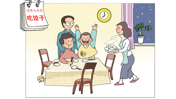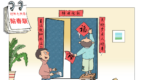過年七天樂——貼春聯。每逢春節,家家戶戶都在門上貼春聯和福字,辭舊迎新。