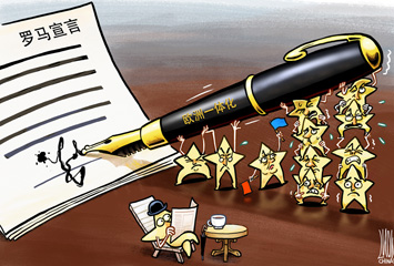 3月25日,除英國之外的歐盟27個成員國領(lǐng)導(dǎo)人齊聚意大利首都羅馬,簽署《羅馬宣言》。