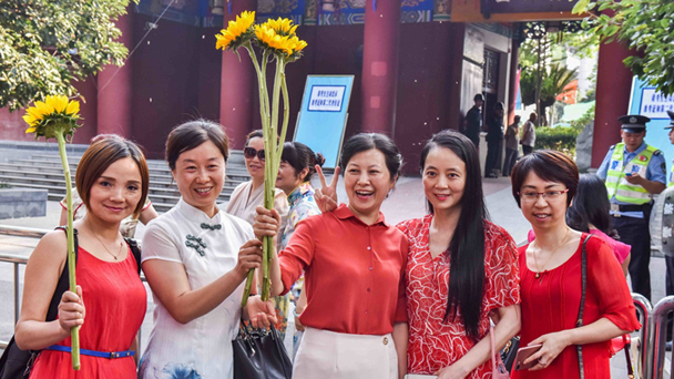 穿旗袍“旗開得勝”舉向日葵“一舉奪魁” 看老師家長如何為考生加油