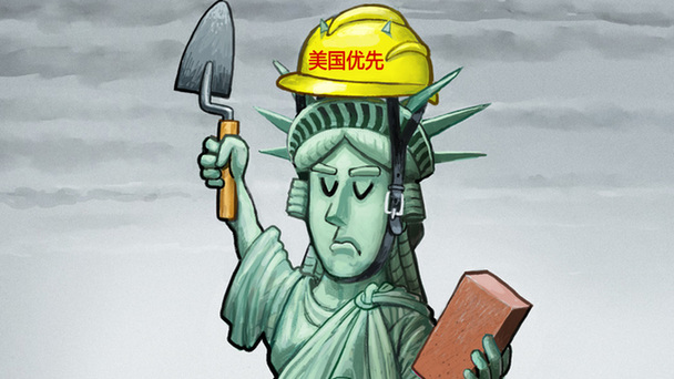 在“美國優(yōu)先”政策的左右下,美國大肆實(shí)行貿(mào)易保護(hù),自由女神變成了一個(gè)砌磚的工人。