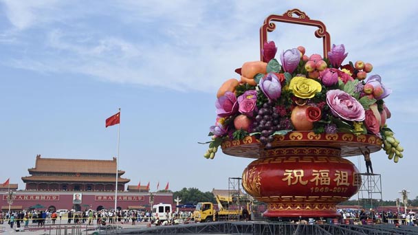 2017年9月25日,北京天安門廣場中心花壇“祝福祖國”巨型花籃布置完畢。今年的大花籃以喜慶的“花果籃”為主景,籃內(nèi)擺放著柿子、石榴、蘋果以及牡丹、玉蘭、月季等仿真花果,寓意十八大以來我國在各領(lǐng)域取得的輝煌成就。