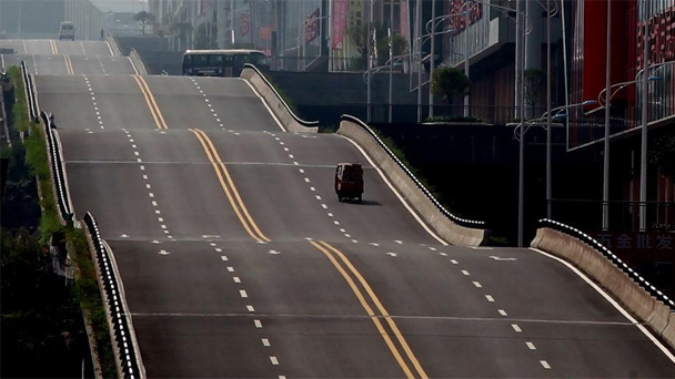 9月7日,重慶巴南界石現(xiàn)波浪形公路,路過的司機稱有騰空的感覺很刺激。因為旁邊的商業(yè)樓共有四層,為了方便每一層樓的商家能夠?qū)④囬_到門口,所以在當(dāng)初規(guī)劃的時候就設(shè)計了這段波浪形狀的公路,方便經(jīng)營戶。