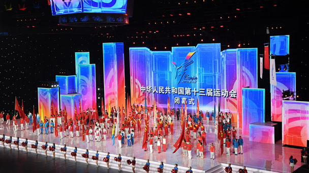 9月8日,中華人民共和國第十三屆運動會閉幕式在天津舉行。這是天津市市長王東峰(前右)、國家體育總局局長茍仲文(前中)和陜西省省長胡和平(前左)在交接會旗后攜手。