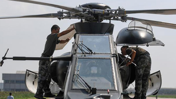 9月9日,在天津中航直升機產(chǎn)業(yè)基地,“風(fēng)雷”飛行表演隊直升機準(zhǔn)備降落。