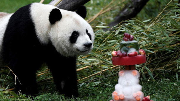 當(dāng)?shù)貢r間9月9日,西班牙馬德里公園為旅居雌性大熊貓竹莉娜(Chulina)慶祝第一個生日。動物園工作人員制作了巨大的竹子“生日蛋糕”為竹莉娜慶生。