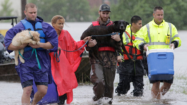 美國得克薩斯州遭颶風襲擊引發洪災,志愿者和消防員幫助居民和寵物撤離。據報道,颶風“哈維”25日登陸得克薩斯州,造成嚴重破壞,導致至少5人死亡。