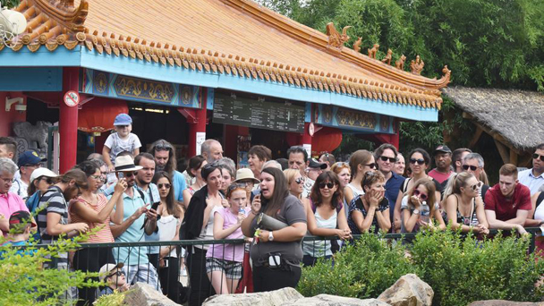 8月5日,在法國博瓦勒野生動(dòng)物園,游客聽工作人員介紹熊貓“媽媽”歡歡和幼崽的最新狀況。8月4日晚間,生活在該園的中國旅法大熊貓“歡歡”誕下一對(duì)雄性雙胞胎,其中一只出生不久后夭折,存活的幼崽狀況良好,體重達(dá)142克。