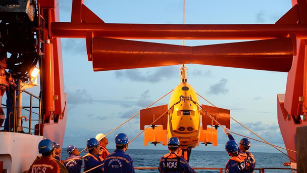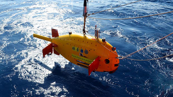 纜控式遙控無人潛水器“發現”號拍攝的自治式水下機器人“探索”號視頻截圖(7月26日攝)。專家表示,這次纜控式與自治式水下機器人深海交會拍攝讓科學家看到了自治式水下機器人的水下工作狀態。
