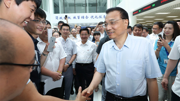 在出席夏季達沃斯論壇期間,中共中央政治局常委、國務院總理李克強在遼寧大連考察。這是6月26日,李克強在遼寧自貿試驗區(qū)大連片區(qū)綜合服務大廳與在現(xiàn)場辦事的企業(yè)人員交流。新華社記者 龐興雷 攝