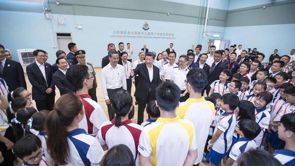 6月30日上午,國家主席習近平來到香港少年警訊永久活動中心暨青少年綜合訓練營考察,看望正在訓練的香港青少年。新華社記者 李濤 攝 6月30日上午,國家主席習近平來到香港少年警訊永久活動中心暨青少年綜合訓練營考察,看望正在訓練的香港青少年。