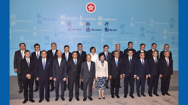 國(guó)務(wù)院于21日任命了香港特別行政區(qū)第五屆政府的主要官員。當(dāng)日下午,候任行政長(zhǎng)官林鄭月娥與第五屆特區(qū)政府主要候任官員,包括政務(wù)司、財(cái)政司及律政司3位司長(zhǎng),13位局長(zhǎng)及其他5位主要官員于特區(qū)政府總部首次全體亮相,