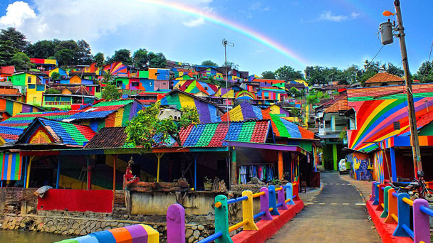 印度尼西亞爪哇省蘭薩里有一個不知名的貧困村Kampung Pelangi,在當(dāng)?shù)卣痛迕竦墓餐ο拢琄ampung Pelangi搖身一變成了光彩奪目的“彩虹村”,吸引著世界各地的游客前來游玩。