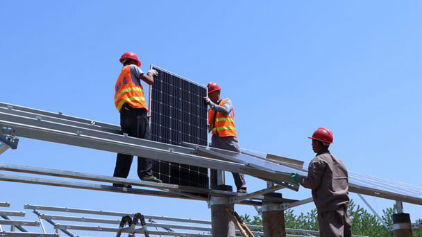 4月29日是五一勞動節假期的第一天,在安徽省臨泉縣呂寨鎮谷河岸邊一個近600畝的光伏扶貧項目工地上,工人們正在緊張施工。
