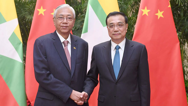 4月10日,國務院總理李克強在北京人民大會堂會見來華進行國事訪問的緬甸總統吳廷覺。新華社記者 張鐸 攝