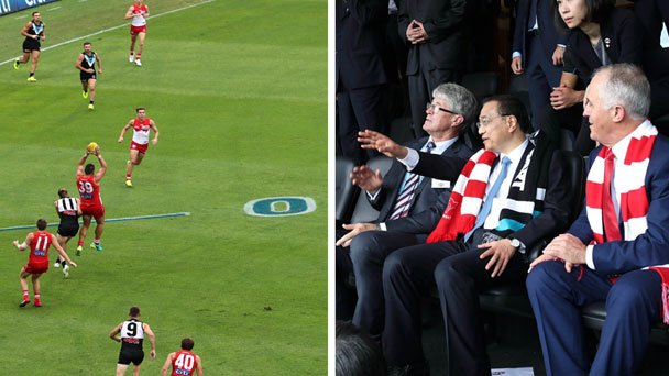 李克強總理與澳大利亞總理特恩布爾25日下午在悉尼現(xiàn)場觀看了澳式橄欖球聯(lián)盟勁旅悉尼天鵝隊與阿德萊德港隊的比賽。賽前,兩位總理在熱身區(qū)與隊員、教練們親切互動,分別向兩支球隊贈送了紀念品。李克強表示,希望澳大利亞球隊來中國比賽,增進兩國的人文交流。