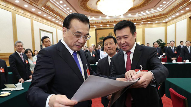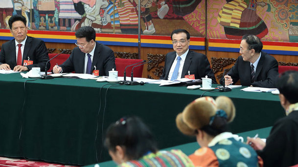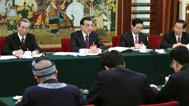 李克強(qiáng)總理9日上午來(lái)到十二屆全國(guó)人大五次會(huì)議陜西代表團(tuán),與代表共同審議報(bào)告。